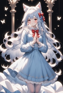 1girl, multiple colored hairs,hair,lovely,cute,whole bodyblue bow,animal ears, red eyes, long hair, very long hair, long sleeves, solo, bow, hair between eyes, bangs,dress, legwear,white hair,chest,pray