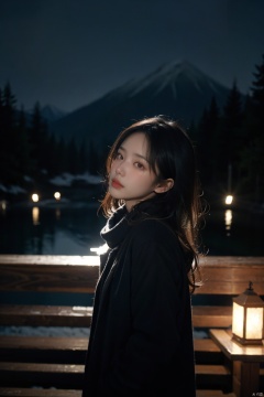 (Not looking at the audience: 1.5),scarf,portrait of 1girl by Bill Henson,Black Cashmere coat,masterpiece,best quality,highres,2girls,flora,snowing,bokeh,low contrast,sharp and in focus,(art by Chris Friel:1.2),(night),sad,melancholy,drillhair,wind,cinematic_angle,(cinematic tone:1.2),mountaintop,cowboy shot,floating hair,rule of thirds,ice lake, 1girl