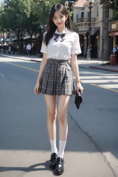 masterpiece,bestquality,realistic,8k,officialart,ultrahighres,1girls,teenager,kawaii,skinny,beautifly face,seductive smile,jk_style,jk_skirt,jk_shirt,(striped),jk_bow,outdoors,slim legs,white socks,loafers,brown shoes,perfect waist to hip ratio,fashionable accessories,skirt,black hair,school uniform,looking at viewer,brown eyes,cosplay,hair ornament,smile,plaid skirt,long hair,jewelry,realistic,lips,bracelet,shirt,brown hair,real world location,solo focus,carousel,disneyland,