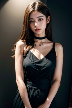 cowboy_shot,(Good structure), DSLR Quality, ,(Front focus),(in the darkness nigth:1.6),Surrealist portraits of women by DavidHockneyandAlphonseMucha,Fantasyart,photographrealistic,动态照明,artstation,red gown,sam yang, 1girll,,,黑Theeye,brownhair,耳Nipple Ring, jewely,black dressed evening dress, cparted lips, looking at viewert, choker necklace,