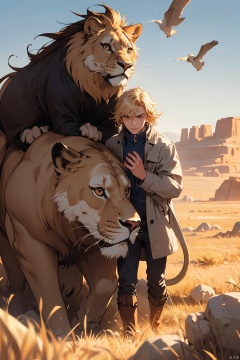A man with golden hair sat on the shoulders of a huge lion, in a blue trench coat and brown boots, the terrain of the desert Gobi, with a lot of rocks and dead grass in the foreground, and the wind blowing their hair