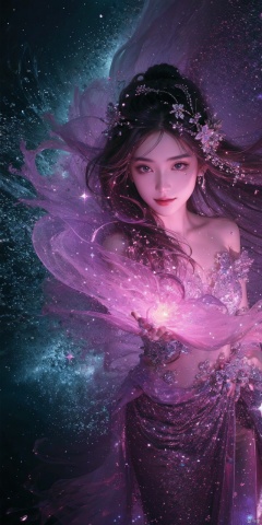 hologram, (detailed ice), Ice magic, Starry sky adorns hair, depth of field, Sank into the starry sea, ((beautiful detailed water)), ((floating)), dynamic angle, water magic, the most beautiful form of chaos, elegant, atmospheric, the background is the magic sky castle, magic flash of fantasy, ((ancient god beast)), magic tower with glitter in the background, cosmos, The furnace of everything, dress, , 1girl, ,