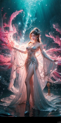hologram, (detailed ice), Ice magic, Starry sky adorns hair, depth of field, Sank into the starry sea, ((beautiful detailed water)), ((floating)), dynamic angle, water magic, the most beautiful form of chaos, elegant, atmospheric, the background is the magic sky castle, magic flash of fantasy, ((ancient god beast)), magic tower with glitter in the background, cosmos, The furnace of everything, dress, , 1girl, ,