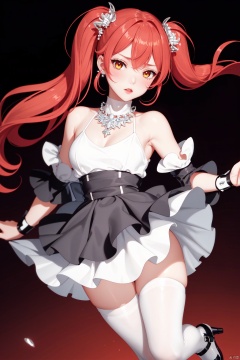Realistic style, cinematic work, 8K wallpaper, masterpiece, very realistic quality, best quality, masterpiece, high-level, high-resolution,,,Edge lighting, dual tone lighting, soft lighting, The illuminated surface of the material has bright spots and highlights, which flicker and have a mirror effect when reflected, There are sparkling spots on the armor,,,1 girl, mature female, solo, full body, looking at viewer, lace, strong rim light, Standard proportion of female body, golden proportion of female body,,,Standing, standing posture, Sexy full body standing posture,,,,(zexi, 1girl, red hair, twintails, low twintails, blush, yellow eyes, ahoge, bangs, hair ornament, crown, long hair, mini crown, floating hair, earrings,white dress, white pantyhose, sleeveless, breasts, shoes, bare shoulders, black bow, bow, small breasts, outstretched arm, frills, white thighhighs, puffy sleeves, thighhighs, detached sleeves, dress, pantyhose, black footwear,:1.2),,bare shoulders, off shoulder, black hairband, bikini bottom only, short dress, swimsuit, pleated dress, bikini, floating hair, blush, ass visible through thighs, skirt,White high-heeled shoes,:1.2),,,colorful,(detailed skin: 1.3), (detailed face: 1.3),clear focus,delicate,(mature women: 1.2),(glossy skin+glossy skin: 1.4),(sweating: 1.1),(big_eyes),red_ eyeshadow,long_ Eyelashes, red lips,,,simple background, grey background,,,(Diamond hair accessories, diamond necklaces, diamond earrings, diamond earrings, clothes embedded with diamonds, armor embedded with diamonds,:1.3),, HDN101, zexi<lora:EMS-325482-EMS:0.300000>