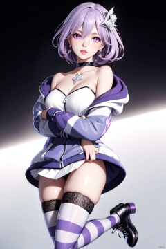 Realistic style, cinematic work, 8K wallpaper, masterpiece, very realistic quality, best quality, masterpiece, high-level, high-resolution,,,Edge lighting, dual tone lighting, soft lighting, The illuminated surface of the material has bright spots and highlights, which flicker and have a mirror effect when reflected, There are sparkling spots on the armor,,,1 girl, mature female, solo, full body, looking at viewer, lace, strong rim light, Standard proportion of female body, golden proportion of female body,,,Standing, standing posture, Sexy full body standing posture,,,,(HDN101, 1girl, purple eyes, purple hair, hair ornament, short hair, blush, hair between eyes,thighhighs, striped, hood, choker, striped thighhighs, jacket, long sleeves, hooded jacket, boots, hooded track jacket, hoodie, zipper, white choker,:1.2),,bare shoulders, off shoulder, black hairband, bikini bottom only, short dress, swimsuit, pleated dress, bikini, floating hair, blush, ass visible through thighs, skirt,White high-heeled shoes,:1.2),,,colorful,(detailed skin: 1.3), (detailed face: 1.3),clear focus,delicate,(mature women: 1.2),(glossy skin+glossy skin: 1.4),(sweating: 1.1),(big_eyes),red_ eyeshadow,long_ Eyelashes, red lips,,,simple background, grey background,,,(Diamond hair accessories, diamond necklaces, diamond earrings, diamond earrings, clothes embedded with diamonds, armor embedded with diamonds,:1.3)<lora:EMS-324609-EMS:0.260000>