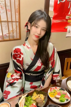 ,riliao,1girl,teenager,8K raw photo,Best quality,masterpiece,ultra high res,upper body,food and alcohol,plate,poster \(object\),table,restaurant,hair over shoulder,red lips,wooden table,sitting,looking at viewer,(yukata:1.2),hairpin, RILIAO