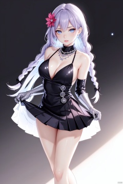 Realistic style, cinematic work, 8K wallpaper, masterpiece, very realistic quality, best quality, masterpiece, high-level, high-resolution,,,Edge lighting, dual tone lighting, soft lighting, The illuminated surface of the material has bright spots and highlights, which flicker and have a mirror effect when reflected, There are sparkling spots on the armor,,,1 girl, mature female, solo, full body, looking at viewer, lace, strong rim light, Standard proportion of female body, golden proportion of female body,,,Standing, standing posture, Sexy full body standing posture,,,,(HDN102 2, 1girl, long hair, purple hair, braid, blue eyes, twin braids, hair ornament, very long hair, hair flower, hair bow, bangs, blush, sideboob, breasts, gloves, power symbol, high heels, black dress, medium breasts, symbol-shaped pupils, elbow gloves, purple heart, dress, skirt hold, black gloves, cup, bow, bare shoulders, backless dress, backless outfit,:1.2),,bare shoulders, off shoulder, black hairband, bikini bottom only, short dress, swimsuit, pleated dress, bikini, floating hair, blush, ass visible through thighs, skirt,White high-heeled shoes,:1.2),,,colorful,(detailed skin: 1.3), (detailed face: 1.3),clear focus,delicate,(mature women: 1.2),(glossy skin+glossy skin: 1.4),(sweating: 1.1),(big_eyes),red_ eyeshadow,long_ Eyelashes, red lips,,,simple background, grey background,,,(Diamond hair accessories, diamond necklaces, diamond earrings, diamond earrings, clothes embedded with diamonds, armor embedded with diamonds,:1.3)<lora:EMS-325500-EMS:0.300000>