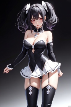 Realistic style, cinematic work, 8K wallpaper, masterpiece, very realistic quality, best quality, masterpiece, high-level, high-resolution,,,Edge lighting, dual tone lighting, soft lighting, The illuminated surface of the material has bright spots and highlights, which flicker and have a mirror effect when reflected, There are sparkling spots on the armor,,,1 girl, mature female, solo, full body, looking at viewer, lace, strong rim light, Standard proportion of female body, golden proportion of female body,,,Standing, standing posture, Sexy full body standing posture,,,,(HDN201, 1girl, black hair, red eyes, twintails, long hair, bangs, very long hair, blush, hair ribbon, hair ornament, floating hair,breasts, cleavage, medium breasts, thighhighs, garter straps, boots, ribbon, bare shoulders, skirt, thigh boots, detached collar, frills, bow, detached sleeves, black thighhighs, white skirt, standing, blue ribbon, blue bow, bridal gauntlets, :1.2),,bare shoulders, off shoulder, black hairband, bikini bottom only, short dress, swimsuit, pleated dress, bikini, floating hair, blush, ass visible through thighs, skirt,White high-heeled shoes,:1.2),,,colorful,(detailed skin: 1.3), (detailed face: 1.3),clear focus,delicate,(mature women: 1.2),(glossy skin+glossy skin: 1.4),(sweating: 1.1),(big_eyes),red_ eyeshadow,long_ Eyelashes, red lips,,,simple background, grey background,,,(Diamond hair accessories, diamond necklaces, diamond earrings, diamond earrings, clothes embedded with diamonds, armor embedded with diamonds,:1.3)<lora:EMS-325502-EMS:0.300000>