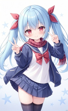 very long hair,twintails,grossissementdedeuxcentsoixantepourcent,grossissementdedeuxcentsoixantepourcent,grossissementdedeuxcentsoixantepourcent,grossissementdedeuxcentsoixantepourcent,grossissementdedeuxcentsoixantepourcent,grossissementdedeuxcentsoixantepourcent,grossissementdedeuxcentsoixantepourcent,grossissementdedeuxcentsoixantepourcent, 1girl, solo, skirt, thighhighs, long_hair, scarf, red_eyes, blue_hair, blue_skirt, smile, pleated_skirt, looking_at_viewer, jacket, ribbon, bow, school_uniform, v, zettai_ryouiki, shirt, red_bow, open_clothes, white_shirt, cowboy_shot, blush, hair_ribbon, sailor_collar, closed_mouth, two_side_up, open_jacket, bangs, outstretched_arm, blue_jacket, standing, anchor_symbol, serafuku, plaid, miniskirt, bowtie, plaid_scarf,loli,loli,loli,loli,loli,loli,loli,loli,