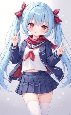 very long hair,twintails,grossissementdedeuxcentsoixantepourcent,grossissementdedeuxcentsoixantepourcent,grossissementdedeuxcentsoixantepourcent,grossissementdedeuxcentsoixantepourcent,grossissementdedeuxcentsoixantepourcent,grossissementdedeuxcentsoixantepourcent,grossissementdedeuxcentsoixantepourcent,grossissementdedeuxcentsoixantepourcent, 1girl, solo, skirt, thighhighs, long_hair, scarf, red_eyes, blue_hair, blue_skirt, smile, pleated_skirt, looking_at_viewer, jacket, ribbon, bow, school_uniform, v, zettai_ryouiki, shirt, red_bow, open_clothes, white_shirt, cowboy_shot, blush, hair_ribbon, sailor_collar, closed_mouth, two_side_up, open_jacket, bangs, outstretched_arm, blue_jacket, standing, anchor_symbol, serafuku, plaid, miniskirt, bowtie, plaid_scarf,loli,loli,loli,loli,loli,loli,loli,loli,