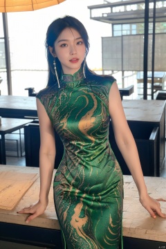 1girl,outdoor,looking_at_viewer,side_blunt_bangs,china_dress,chinese_style,big breasts,pose,solo,1girl,black hair,black eyes, , qipao