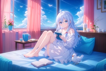 tianliang duohe fangdongye,chen bin,omone,,((masterpiece, best quality)),beautifuldetailedlighting,1girl, 1girl, solo, long hair, looking at viewer, blush, bangs, blue eyes, shirt, long sleeves, ribbon, holding, hair between eyes, sitting, collarbone, full body, hair ribbon, white shirt, braid, ahoge, white hair, thighs, open clothes, sky, barefoot, day, collared shirt, cloud, indoors, off shoulder, feet, cup, blue sky, legs, pillow, book, bare legs, window, bed, toes, bird, on bed, holding cup, knees up, mug, book stack, elaina \(majo no tabitabi\)