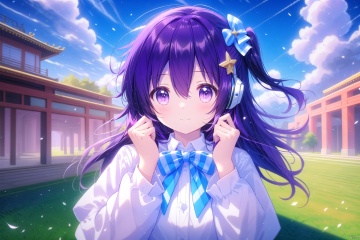tianliang duohe fangdongye,chen bin,omone,,((masterpiece, best quality)),beautifuldetailedlighting,1girl, 1girl, solo, long hair, breasts, looking at viewer, blush, smile, bangs, shirt, hair ornament, long sleeves, bow, hair between eyes, medium breasts, closed mouth, purple eyes, white shirt, upper body, hair bow, outdoors, sky, day, hairclip, striped, puffy sleeves, collared shirt, cloud, bowtie, star \(symbol\), vest, two side up, blue sky, hands up, black bow, headphones, cloudy sky, purple bow, striped bow, purple bowtie