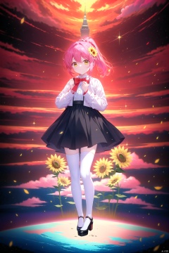 tianliang duohe fangdongye,chen bin,omone,,((masterpiece, best quality)),beautifuldetailedlighting, (best quality),((masterpiece)),(highres),standing,(full body),(black thighhighs),original,extremely detailed wallpaper,(an extremely delicate and beautiful),(loli:1.2),(petite:1.2),Pink hair,Yellow eyes,(red Jacket),high ponytail,white collared shirt,hair flower,fipped hair,floating hair,Frown,hands in pockets,black dress,red bowtie,(solo),sky,skyline,skyscraper,smile,solo,sunflower,tower,upper_body,white flower, solo