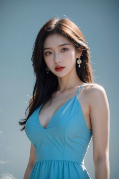 1girl, Colored smoke background,light blue dress,standing, upper body, Explosion smoke,yellow background, nice boobs,
