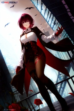 city, scenery, cityscape, building, cloud, sky, skyscraper, day, 1girl, bridge, outdoors, water, ocean, blue_sky, boat, watercraft, railing, cloudy_sky, solo, short_hair, skyline, bird, building architecture,real_world_location,rose,gradient, gradient_background, breasts, red_rose, red_flower, solo, cleavage, looking_at_viewer ,