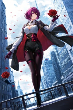 city, scenery, cityscape, building, cloud, sky, skyscraper, day, 1girl, bridge, outdoors, water, ocean, blue_sky, boat, watercraft, railing, cloudy_sky, solo, short_hair, skyline, bird, building architecture,real_world_location,rose,gradient, gradient_background, breasts, red_rose, red_flower, solo, cleavage, looking_at_viewer ,