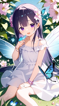 1girl, kashiwazaki sena, kochou shinobu, uruha rushia, solo, best quality, blurry background, looking at viewer, sitting, looking at animal, crying with eyes open, flying, blush, open mouth, purple eyes, mole under eye, black hair, multicolored hair, butterfly hair ornament, very long hair, hair flower, bangs, white dress, sleeveless dress, bird on shoulder, bare shoulders, ring, butterfly wings, insect wings, bracelet, pink flower, blue butterfly, fang, depth of field, outdoors, blurry foreground, bare arms, butterfly on hand, glowing butterfly, white butterfly, yellow butterfly, dragonfly, beetle, paper crane, butterfly net, fairy, bird on head, sparrow, pinwheel, spider, ladybug, bird on hand, ginkgo leaf, butterfly print, shuriken, saint quartz \(fate\), crow, squiggle, jet, parrot, deer, dove, purple flower, motion blur, blue feathers, mikazuki yozora, :d, daisy