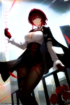 city, scenery, cityscape, building, cloud, sky, skyscraper, day, 1girl, bridge, outdoors, water, ocean, blue_sky, boat, watercraft, railing, cloudy_sky, solo, short_hair, skyline, bird, building architecture,real_world_location,rose,gradient, gradient_background, breasts, Lycoris flowers, Red Spider Lily,Red Spider Lily,solo, cleavage, looking_at_viewer ,