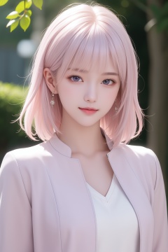 (masterpiece, best quality), intricate details, thin, ((slim)), beautiful girl, Light pink hair, white skin, light purple eyes, sharp jawline, cropped jacket, messy hair, lips, upper body, close up, smirk, outdoors,