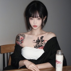 1girl, solo, looking at viewer, short hair, bangs, black hair, jewelry, sitting, jacket, upper body, earrings, blunt bangs, cup, lips, black jacket, grey eyes, strapless, tattoo, chair, table, bandeau, tube top, arm tattoo, A girl with a tattoo on her right should,clean background, Light master