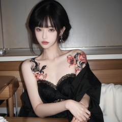 1girl, solo, looking at viewer, short hair, bangs, black hair, jewelry, sitting, jacket, upper body, earrings, blunt bangs, cup, lips, Bra, small amount of dress lace, grey eyes, strapless, tattoo, chair, table, bandeau, tube top, arm tattoo, A girl with a tattoo on her right should,clean background, Light master