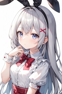 loli,petite,1girl, solo, bow, upper_body, long_hair, short_sleeves, hair_ornament, red_bow, rabbit_ears, puffy_sleeves, puffy_short_sleeves, animal_ears, hand_up, hairclip, breasts, looking_at_viewer, closed_mouth, center_frills, bangs, x_hair_ornament, simple_background, white_background, grey_hair, shirt, :<, hair_bow, bowtie, frills, pink_dress, hairband, white_shirt, collared_shirt, grey_eyes, two_side_up, red_bowtie