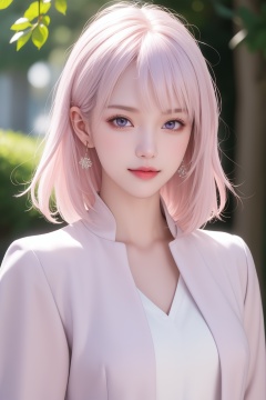 (masterpiece, best quality), intricate details, thin, ((slim)), beautiful girl, Light pink hair, white skin, light purple eyes, sharp jawline, cropped jacket, messy hair, lips, upper body, close up, smirk, outdoors,