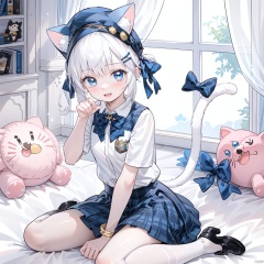 bangbi, 1girl, blue eyes, wariza, sitting, tail, hair ornament, socks, solo, looking at viewer, white hair, cat tail, open mouth, skirt, hat, shirt, plaid, tail ornament, animal ears, window, indoors, white shirt, cat ears, paw pose, shoes, bangs, black footwear, short sleeves, fang, vest, bow, between legs, stuffed toy, grey socks, string of flags, blue bow, blue headwear, hairclip, stuffed cat, x hair ornament, black socks, smile, hand between legs, stuffed animal, jewelry, kneehighs, hand up, star \(symbol\), blue skirt, cat, bangbi