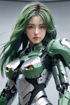 1 girl, huge breasts, big chest,full body:1.5, messy green long hair, realistic, perfect murge, ,Mecha body,Young beauty spirit .Best Quality, photorealistic, ultra-detailed, finely detailed, high resolution, perfect dynamic composition, sharp-focus,b3rli,dongtan dress,