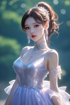 caihong,1girl,solo,dress,ponytail,upper body,parted lips,looking at viewer,breasts,blurry background,bare shoulders,hair ornament,<lora:caihong1.5:0.8>,