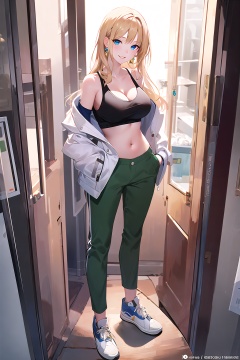 (best quality), ((masterpiece)), (highres), illustration, original, extremely detailed, 1girl, solo, long hair, breasts, white background, full body, yellow background, blonde hair, sneakers, pants, shoes, blue eyes, looking at viewer, navel, white footwear, jewelry, earrings, crop top, off shoulder, midriff, jacket, hands in pockets, bare shoulders, green pants, smile, standing, cleavage, parted lips, open clothes, **** top, medium breasts, collarbone, open jacket, floating hair,white jacket,nai3 style, nai3style