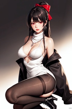 Realistic style, cinematic work, 8K wallpaper, masterpiece, very realistic quality, best quality, masterpiece, high-level, high-resolution,,,Edge lighting, dual tone lighting, soft lighting, The illuminated surface of the material has bright spots and highlights, which flicker and have a mirror effect when reflected, There are sparkling spots on the armor,,,1 girl, mature female, solo, full body, looking at viewer, lace, strong rim light, Standard proportion of female body, golden proportion of female body,,,Standing, standing posture, Sexy full body standing posture,,,,(aheye3, 1girl, long hair, red eyes, black hair, very long hair, hair ornament, ponytail, ahoge, hair ribbon, hairclip, bangs,,, boots, pantyhose, breasts, open clothes, sweater dress, sweater, high heel boots, long sleeves, dress, high heels, crepe, open coat, coat, red ribbon, brown footwear, brown coat, ribbon, alternate costume, turtleneck, aran sweater, large breasts, cable knit, black pantyhose, white dress, turtleneck sweater, cross-laced footwear, lace-up boots, casual, ribbed sweater, off shoulder, open jacket, medium breasts, white sweater, jacket, bare shoulders,:1.2),,bare shoulders, off shoulder, black hairband, bikini bottom only, short dress, swimsuit, pleated dress, bikini, floating hair, blush, ass visible through thighs, skirt,White high-heeled shoes,:1.2),,,colorful,(detailed skin: 1.3), (detailed face: 1.3),clear focus,delicate,(mature women: 1.2),(glossy skin+glossy skin: 1.4),(sweating: 1.1),(big_eyes),red_ eyeshadow,long_ Eyelashes, red lips,,,simple background, grey background,,,(Diamond hair accessories, diamond necklaces, diamond earrings, diamond earrings, clothes embedded with diamonds, armor embedded with diamonds,:1.3),,,aheye<lora:EMS-318965-EMS:0.300000>