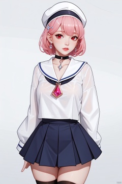 Realistic style, cinematic work, 8K wallpaper, masterpiece, very realistic quality, best quality, masterpiece, high-level, high-resolution,,,Edge lighting, dual tone lighting, soft lighting, The illuminated surface of the material has bright spots and highlights, which flicker and have a mirror effect when reflected, There are sparkling spots on the armor,,,1 girl, mature female, solo, full body, looking at viewer, lace, strong rim light, Standard proportion of female body, golden proportion of female body,,,Standing, standing posture, Sexy full body standing posture,,,,(aierwen2, 1girl, red eyes, pink hair, bangs, short hair, white headwear, medium hair, hairband, tilted headwear,,,thighhighs, skirt, hat, white thighhighs, blue skirt, sailor collar, long sleeves, choker, shirt, sailor hat, white shirt,:1.2),,bare shoulders, off shoulder, black hairband, bikini bottom only, short dress, swimsuit, pleated dress, bikini, floating hair, blush, ass visible through thighs, skirt,White high-heeled shoes,:1.2),,,colorful,(detailed skin: 1.3), (detailed face: 1.3),clear focus,delicate,(mature women: 1.2),(glossy skin+glossy skin: 1.4),(sweating: 1.1),(big_eyes),red_ eyeshadow,long_ Eyelashes, red lips,,,simple background, grey background,,,(Diamond hair accessories, diamond necklaces, diamond earrings, diamond earrings, clothes embedded with diamonds, armor embedded with diamonds,:1.3),,,aierwen<lora:EMS-318966-EMS:0.300000>