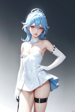 Realistic style, cinematic work, 8K wallpaper, masterpiece, very realistic quality, best quality, masterpiece, high-level, high-resolution,,,Edge lighting, dual tone lighting, soft lighting, The illuminated surface of the material has bright spots and highlights, which flicker and have a mirror effect when reflected, There are sparkling spots on the armor,,,1 girl, mature female, solo, full body, looking at viewer, lace, strong rim light, Standard proportion of female body, golden proportion of female body,,,Standing, standing posture, Sexy full body standing posture,,,,(HDN302-1, 1girl, red eyes, short hair with long locks, blue hair, ahoge, hair between eyes, light blue hair, dress, gloves, elbow gloves, sidelocks, white dress, white gloves, crown, symbol-shaped pupils, bare shoulders, thigh strap, blue footwear, bare legs, shoes, small breasts, strapless dress, strapless, sleeveless, blue bow, ribbon,:1.2),,bare shoulders, off shoulder, black hairband, bikini bottom only, short dress, swimsuit, pleated dress, bikini, floating hair, blush, ass visible through thighs, skirt,White high-heeled shoes,:1.2),,,colorful,(detailed skin: 1.3), (detailed face: 1.3),clear focus,delicate,(mature women: 1.2),(glossy skin+glossy skin: 1.4),(sweating: 1.1),(big_eyes),red_ eyeshadow,long_ Eyelashes, red lips,,,simple background, grey background,,,(Diamond hair accessories, diamond necklaces, diamond earrings, diamond earrings, clothes embedded with diamonds, armor embedded with diamonds,:1.3)<lora:EMS-322046-EMS:0.250000>