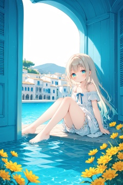 (masterpiece),(best quality),illustration,ultra detailed,hdr,Depth of field,(colorful),loli,Yellow flowers,Blue wall,Closed windows,excess surface water,Mediterranean style architecture,1girl,barefoot,blue_nails,toenails,bloomers,solo,aqua_nails,feet,long_hair,linen hair,bare legs,barefoot,bare legs,sit on the ground,White off-shoulder dress,Silk skirt,<lora:YoRHa 1.3-000030:0.5>,