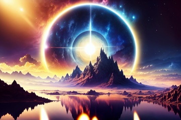 scenery, no humans, cloud, star \(sky\), sky, reflection, starry sky, planet, mountain, sun, fantasy, outdoors, water, surface, space, cloudy sky, Star Aperture, landscape