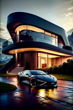 car,ground vehicle,no humans,reflection,sky,cloud,outdoors,vehicle focus,night,sports car,rain,cloudy sky,tree,water,scenery,mountain,glass,Line Neon,Interior Lighting,building,