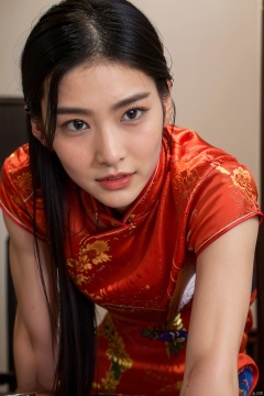 (1girl:1.3),(best quality, masterpiece, ultra-high resolution, 4K, HDR, UHD, 64K, official art), (photorealistic:1.3), (realistic:1.3), depth of field, (portrait:1.3),(sfw:1.4),,china_dress,chinese_style,big breasts,pose,solo,1girl,black hair,black eyes, , ring, cheongsam