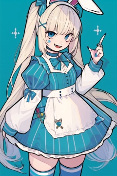 CH, high contrast, 1girl, solo, long hair, looking at viewer, smile, open mouth, bangs, blue eyes, blonde hair, hair ornament, thighhighs, long sleeves, dress, bow, ribbon, holding, animal ears, twintails, jewelry, hairband, frills, food, choker, hairclip, striped, puffy sleeves, nail polish, rabbit ears, fake animal ears, blue dress, fangs, blue background, stuffed toy, stuffed animal, x hair ornament, juliet sleeves, striped thighhighs, blue nails, middle finger