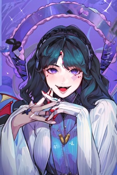 CH, high contrast, 1Girl, solo, looking at the audience, blue blue smile, short hair, open mouth, bangs, black hair accessories, long sleeves, black and red Gothic Lolita, bow, holding, jewelry, headband, food, demon wings, demon tail, Lolita fashion, Gothic Lolita, Lolita headband, macaron, purple background