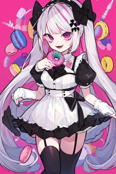 CH,high contrast,1girl,solo,long hair,looking at viewer,smile,open mouth,bangs,hair ornament,thighhighs,dress,bow,holding,twintails,purple eyes,white hair,short sleeves,hairband,food,puffy sleeves,black thighhighs,nail polish,puffy short sleeves,fangs,garter straps,drill hair,pink background,pink nails,doughnut,macaron,