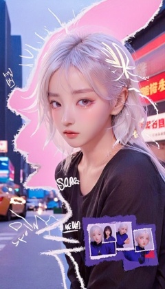 <lora:xl-shanbailing-24-0320Animated Spliced Reality2:0.7>,Animated Spliced Reality,a girl made of anime and reality,anime in reality,anime lines around real girl,photo background,the girl is part reality and part caricature,1girl,solo,bangs,white hair,street,city,
