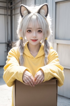 [(white background:1.4)::5],//,box,in container,cardboard box,in box,//,(solo:1.2),1girl,loli,little girl,smile,open mouth,black eyes,slit pupils,white hair,low twintails,cat ears,full body,(yellow animal costume:1.2),hood up,
