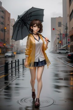 ((HRD, HUD, 8K)),((masterpiece, best quality)), highly detailed,1girl, solo, short hair, brown eyes, raincoat, city, rain, holding umbrella, looking at viewer,