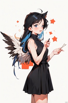 (wings:1.5),loli,petite,1girl, one_eye_closed, solo, dress, long_hair, blue_eyes, smile, blue_hair, black_dress, open_mouth, breasts, looking_at_viewer, bangs, medium_breasts, sleeveless, shiny, (\shen ming shao nv\), (\ji jian\), babata,wings, (\MBTI\), liuqiyue, jiqing, maolilan