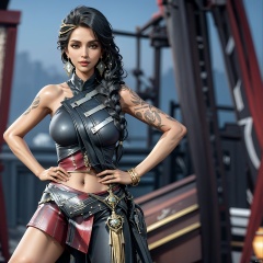 Girl, single, long hair, chest, looking at the audience, skirt, shirt, dark hair, navel, Handheld, Bare shoulders, brown eyes, Jewelry, Smile, Standing, Braid, cowboy shot, Earrings, Outdoor, sleeveless, Day, navel, mini skirt, bracelet, lips, crop top, Tattoo, shoulder hair, arm Tattoo, game background, hands on hips,shamila,