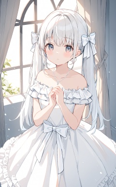 (best quality), ((masterpiece))Thin lines, 1girl, white theme, dress, solo, white dress, necklace, jewelry, long hair, looking at viewer, white hair, bow, hair bow, window, bird, blush, bangs, frills, curtains, off shoulder, white bow, bare shoulders, off-shoulder dress, twintails, wedding dress, own hands together