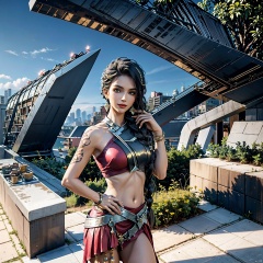 Girl, single, long hair, chest, looking at the audience, skirt, shirt, dark hair, navel, Handheld, bare shoulders, brown eyes, Jewelry, smile, mole, standing, Braid, cowboy shot, Earrings, outdoor, sleeveless, day, navel, mini skirt, bracelet, lips, crop top, Tattoo, shoulder hair, arm tattoo, MIR, ArchModern,Commercial, Museum, Outdoor,OfficeBuilding,Landscape,Sports Center,Arc landscape,Trestle,Super high-rise, hand on hip,shamila, MIR