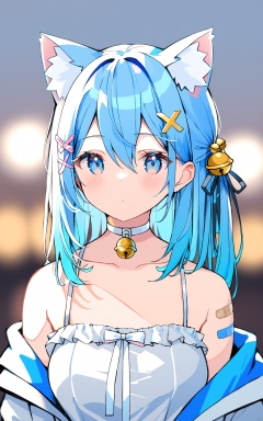 (best quality), ((masterpiece))Thin lines, 1girl, solo, sleeveless dress, animal ears, blue eyes, bell, jingle bell, sleeveless, long hair, dress, jacket, blush, hair ornament, bangs, bare shoulders, blurry background, hair between eyes, animal ear fluff, white dress, open jacket, x hair ornament, upper body, cat ears, multicolored hair, blue hair, breasts, blurry, off shoulder, depth of field, open clothes, looking at viewer, collarbone, bandaid, closed mouth, bow, white jacket, gradient hair, neck bell
